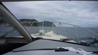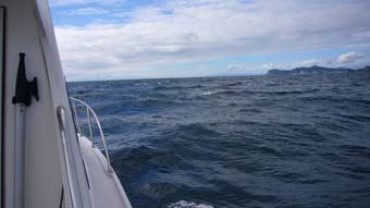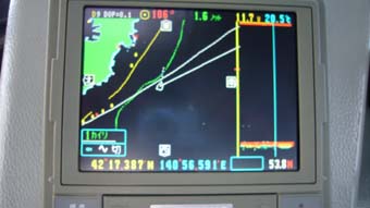 出港時は波の状態も良かったが、沖に行くにつれて白波出はじめ、 これではナブラ発見しずらいです・・・鳥山も無し・・・ 怪しい魚探反応でジギングもアタリなし。 噴火湾内でナブラ探しましょう。移動。 |