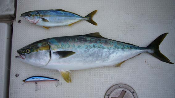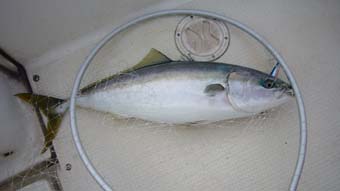 | あちこち走り回るもナブラ発見出来ず・・・ 仕方ないのでとりあえず昨年釣れた場所でやってみましょう。 やや怪しい魚探反応あり。ミノーやや沈めて3投目にフクラギHIT! フクラギでもいいやと続けていると、追直沖位まで流れたあたりで ドカンと来ました。ブリ確信! 久しぶりのひきを味わったあと揚がってきたのは、、、 ブリまでは行かない68cmワラサ。 まだまだやりたかったが時間終了。 |